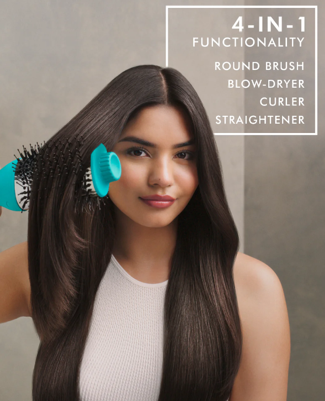 Αυτό το εργαλείο styling 4 σε 1 συνδυάζει τα πλεονεκτήματα μιας στρογγυλής βούρτσας, του στεγνωτηρίου, του ισιωτικού και του ψαλιδιού για να παράγει αποτελέσματα ποιότητας κομμωτηρίου για όλους τους τύπους μαλλιών.